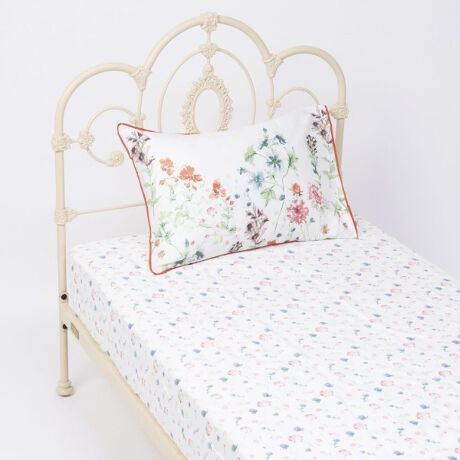 水彩タッチで淡く描いた大ぶりのフラワープリントのピローケースは、裏面はさりげなく小ぶりに描いてメリハリをつけたこだわりのデザインです。