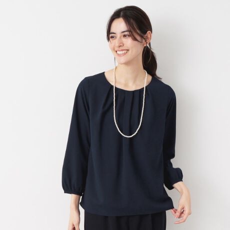 お顔回りが華やかになるタック使いのシンプルなブラウス。身頃が2重の仕立てで、透け感をカバーしています。