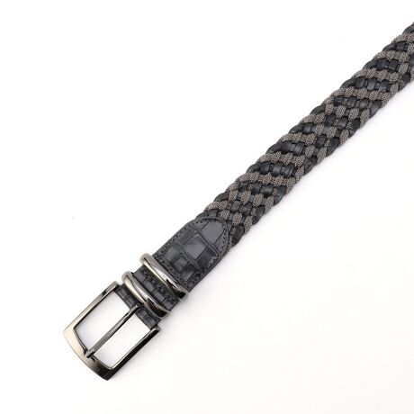 職人の手によってタンニン鞣しされたクロコ型押しのイタリアンレザーと、日本製ナイロンテープを組み合わせた高級感あるメッシュベルトです。バックルとW使いのサルカンはブラックニッケルのメタルパーツを使用することで、より一層上質な印象に。カジュアルからドレススタイルまで合わせを問わずにご着用いただけます。