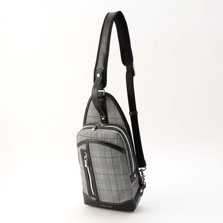 光沢感のある地柄素材と合皮の別生地切り替えがスタイリッシュな印象のきれいめボディバッグです。フロント底部に刻印したブランドロゴをアクセントに、フロントのあおりポケット仕様やショルダーベルトには別生地のハンドルを設けて使い勝手も申し分ないです。