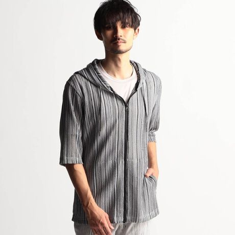 5分袖のフードパーカー。身返し裏ファスナー部分のテープ仕立て等、出来るだけ軽い作りにしています。メッシュ素材のパーカーですので、盛夏の羽織でも活躍してくれます。