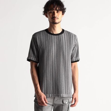 アウターにはタテ編みに編まれたラッセルレース素材を使用。レースの編み目の透け感は見た目にも涼し気な印象。ラッセル編みのニットですので、ストレッチ性も高く、着心地は抜群です。無地(49ブラック)1色と、マルチストライプ(91グレーストライプ、92ブルーストライプ、93グリーンストライプ)3色での展開です。インナーにはレイヤードする事を考え、薄手のポリエステル天竺素材を使用。薄く、通気性の高い素材感は夏でも快適に着用頂けます。