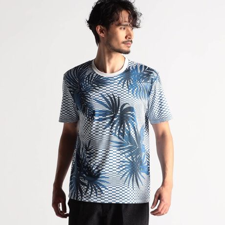 絶妙なモチーフバランスにこだわったインパクト系総柄プリントTシャツ。ジオメトリック柄とボタニカル柄を組合せ、グラデーションにより奥行き感をつけることで立体感を生み出しています。陰影をモノトーンカラーで表現し、存在感のあるデザインに仕上げました。昇華転写の加工技法を使い、生地の風合いを損ねることなく繊細に仕上げています。