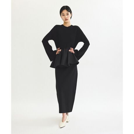 コンパクトなニットのウエストから広がる異素材のペプラムシルエットが魅力的なワンピース。