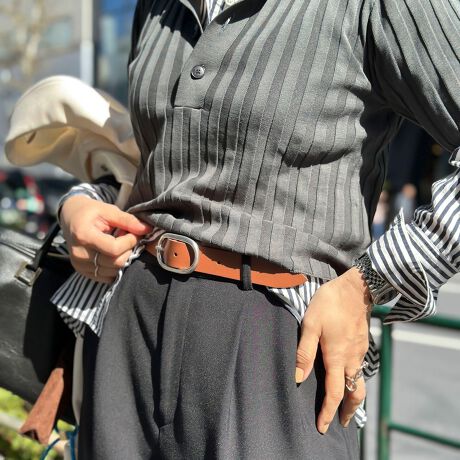 ・太めのレザーに、存在感のあるオーバル型のシルバーバックルがポイント