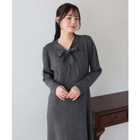 首元にあしらったボウタイが目を惹くニットワンピース。
