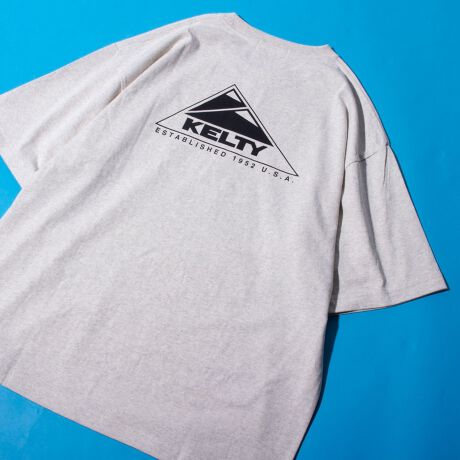 目を惹くKELTYらしいアウトドアモチーフのバックプリントロゴ、フロントはシンプルにクラシックロゴのワンポイントのデザイン。