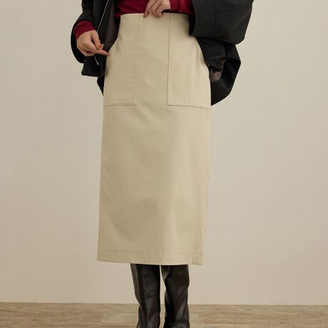 定番のポケット付きタイトスカート。インでもアウトでもきまるハイウエストデザインで、スタイルよく着用できるアイテムです。TOPSは布帛でもニットカットでもどんなデザインでもきまり、お仕事にも普段使いにも着用できる汎用性があります。