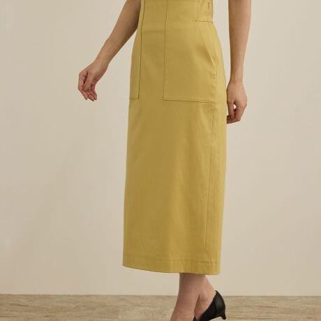 定番のポケット付きタイトスカート。インでもアウトでもきまるハイウエストデザインで、スタイルよく着用できるアイテムです。TOPSは布帛でもニットカットでもどんなデザインでもきまり、お仕事にも普段使いにも着用できる汎用性があります。