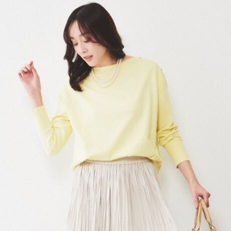 プリーツやフレアスカートに合わせたり、前裾をハーフインしてバランスを取れば、合わせるボトムの幅も広がります。