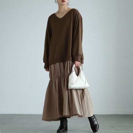 ラフにこなれるメリハリシルエットを纏う異素材ドッキングワンピース。ワンツーコーデのようなドッキングデザインで、一枚でこなれるワンピース。Vネックの首元でお顔周りをすっきりさせ、大人っぽさを演出します。ゆったり身幅で体型を拾わず、リラクシーに体型カバーも狙える一枚。シャリ感のあるギャザースカートがふんわりと揺れ、シルエットに甘さをプラス。太ももあたりにギャザーを置くことで、膨らみ過ぎずメリハリを演出。フルレングス丈で上品さをアップし、脚長効果を促します。