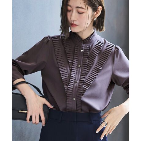 贅沢なプリーツ使いが上品な格上げブラウスは、メタル風ボタンで甘すぎないシャープな印象に。