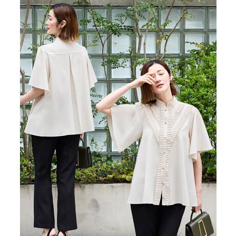 贅沢なプリーツ使いが上品な格上げブラウスは、メタル風ボタンで甘すぎないシャープな印象に。