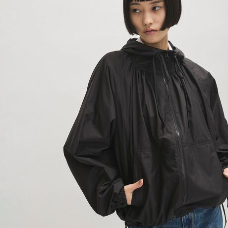 ライトウェイトな合繊素材で、ギャザーや切り替えを駆使し、ふんわりとバルーンシルエットを作ったスポーティーながらフェミニンな雰囲気のパーカー。