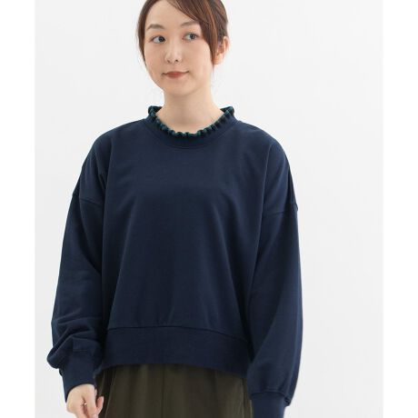 空気の力で撚り合わせる空紡糸を、裏毛組織にすることでボリューム感とシャリ感を表現しました。定番のニットフリルがアクセントになったプルオーバー。ニットフリルはちびフリルで編み立て、配色も効かせています。袖口と裾はリブになっているのでカジュアルなアイテムと相性抜群◎プードゥドゥらしい一癖あるアイテムとして、普段のコーディネートに遊び心をプラスできる1枚です。