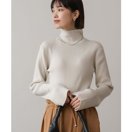 シンプルなボトルネックのリブタートルに袖先がベルスリーブの大人かわいいニット。