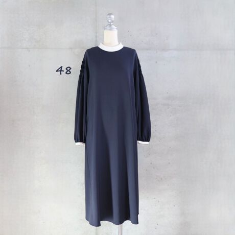 袖に施したピンタックのワンピース。スッキリとしたシルエットに別布使いがさりげないアクセントになっています。