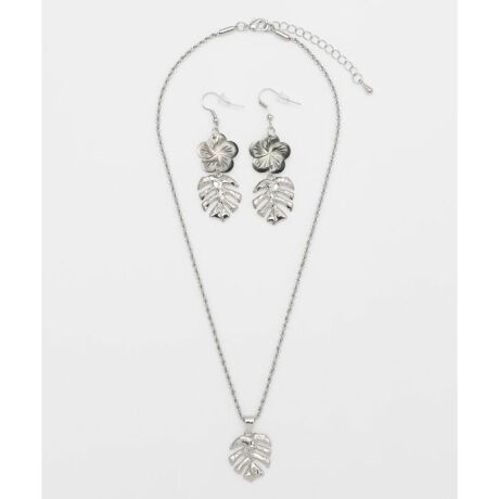 [型番:47WZ5104-2024]モンステラと煌めくシェルのプルメリアのネックレスセット。ネックレスとピアスがセットになっており、一緒につけても、別々につけても、その日の気分やコーディネートに合わせてお楽しみください。
