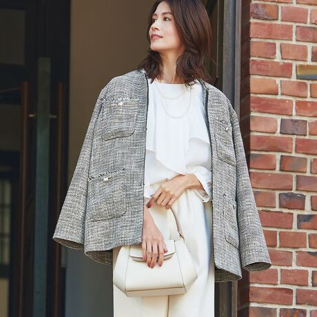 合わせやすく落ち着きのある色見のツィードノーカラージャケット。王道のツイードママジャケットとは一線を画す、コンサバにならない少しゆとりのあるサイズ感が◎オンオフどちらにも活用でき重宝するアイテムです。フリンジ使いでシックな中にも抜け感のある着こなしに。