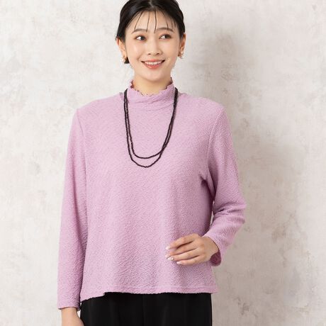 襟端がフリル調になったスタンドカラーのデザインで、気になる首元をさり気なくカバーしてくれます。