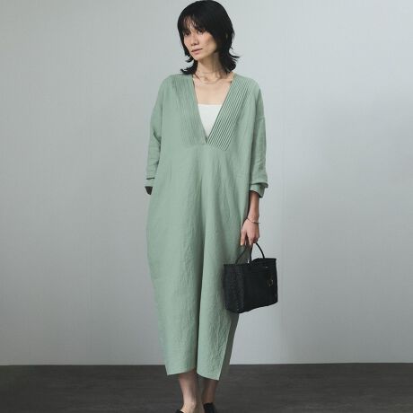 衿回りの繊細なピンタックとニュアンスのあるドレープが印象的なカフタンシルエットのワンピース。
