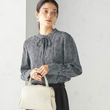 バンドカラーに細リボンタイを施したピンタック入りブラウスです。