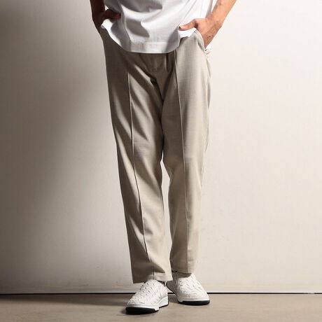 前身の中心、折山部分を摘まんでピンタックにしているデザインイージーパンツ。ウエストはイージーパンツ仕様ですが、スピンドルを内側にしまえばベルトを使用してジャケットスタイルに対応出来ます。リエラボならではのバックスタイルにこだわったトリプルループをアクセントに、右後ろ設けたモバイルポケットやフロントの別注本水牛釦を使い、差別化を図っています。裏側の別布にはメッシュ裏地を使用して清涼感を更に高めています。