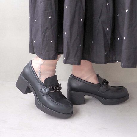 byあしながおじさんで人気のヒールアップローファーからチェーンビットデザインが登場。重厚感ある大ぶりの喜平チェーンがコーデのアクセントに。シンプルなブラックはお仕事用にもおすすめです。