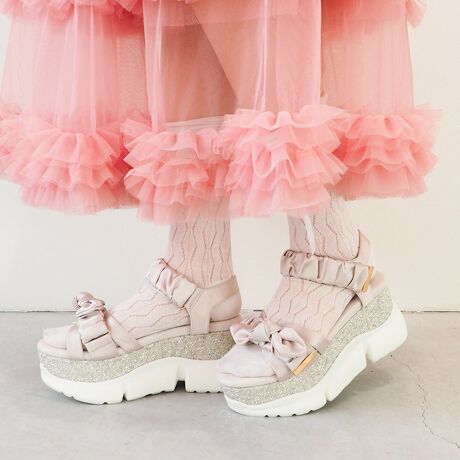 キラッキラのグリッターソールが目を惹く、フェミニンなスポーツサンダル。トレンドのリボンとシャーリングデザインはサテン素材でより可愛らしく。リボンは取り外しができる2WAY仕様。リボンを外してシンプルに履くこともできます。