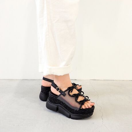 キラッキラのグリッターソールが目を惹くスポーツサンダル。三連になったリボンやチュール素材でトレンド感たっぷりな一足。