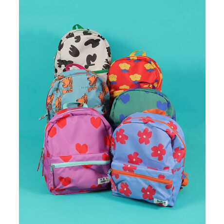 4歳の娘にMサイズを購入しました。全体が濃いピンクでハートが沢山で可愛くて、娘もお気に入りです。保育園用に購入しましたが、荷物がたくさん入ります。少し薄めな生地ですが、値段がお手頃なので許容範囲かなと思ってます。なかなか被らないデザインで目立つので、オリジナル感があって気に入りました!!