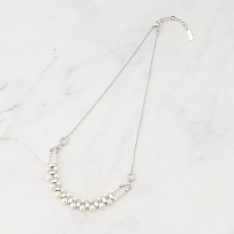 ゴールドのパーツとパール調のパーツが組み合わさっていて洗練されたエレガントなデザインネックレス。