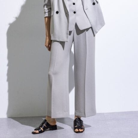 ウエストに入れたタックでゆとりがありますが、センタープレスによりすっきりと穿いていただけます。