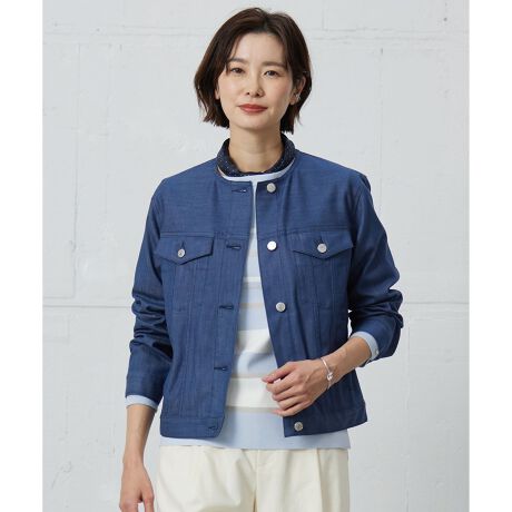 【洗える】セルロースシャンブレー ノーカラー デニム ジャケット