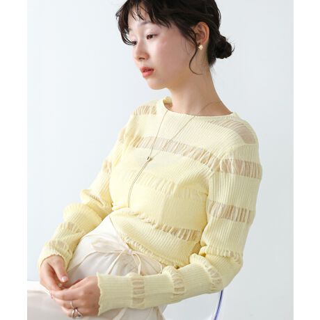 シアーボーダーが抜け感を演出する軽やかなニットトップス!程よい肌見せが女性らしさを引き立てます。裾や袖口のメロウ始末が、繊細でフェミニンなアクセントに。トレンド感を押さえながら1枚でコーデを格上げする万能デザインです。優れた伸縮性で着心地も快適。オンにもオフにも取り入れやすいアイテムです。