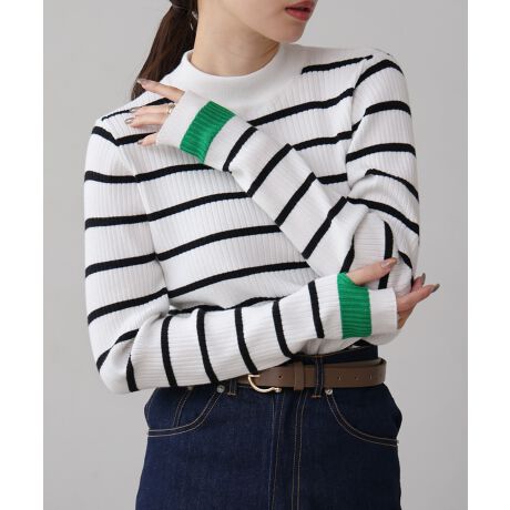 手首にさりげないライン配色がアクセントになった、大人の遊び心を感じさせるリブニット。シンプルな中にもトレンドを取り入れたサムホール付きのデザインで 指先までおしゃれを楽しめます。ボトルネックのシルエットは顔周りをすっきり見せつつ 程よく知的で洗練された印象を演出。体に優しくフィットするシルエットで女性らしく美しいラインを引き立ててくれます。デイリースタイルからちょっとしたお出かけまで、幅広く活躍する万能アイテムです。