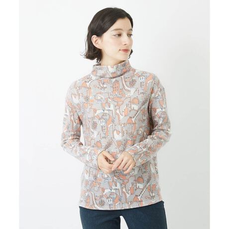 ポップでキュートな街並みのイラストプリントのハイネックプルオーバー。