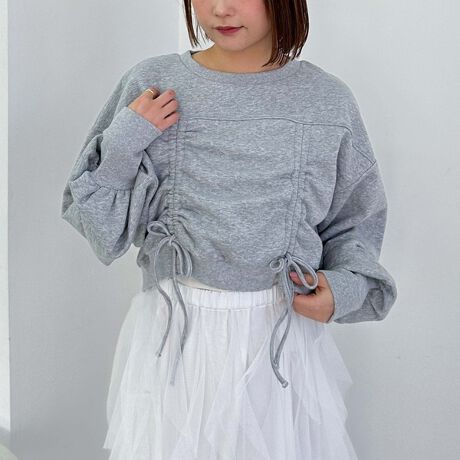 袖にもたっぷりとボリュームを持たせ、カジュアルなスウェットも女性らしい印象に。