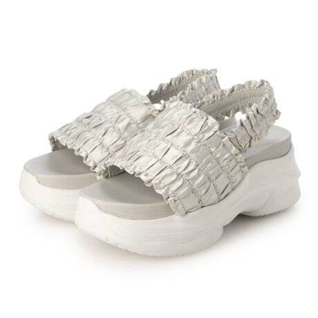 XSサイズからLLサイズまでのサイズ展開!たっぷりのギャザーフリルが夏のコーディネートに華やかさをプラスする厚底スポーツサンダル。深めの甲ベルトは裏に当て生地があるのでしっかり足にフィットしてくれて安定感抜群。かかとはゴム仕様なので片手でスッと履けるのも嬉しいポイント。低反発のふかふかインソールで長時間の使用にもストレスを感じにくい履き心地です。