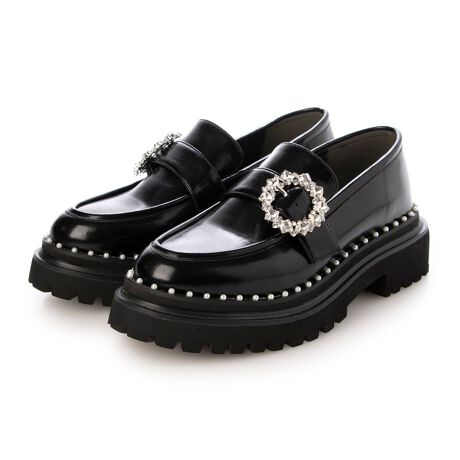 カジュアルな印象のトラックソールにキラキラのビジューと細やかなパールをコバ周りに施してレディな雰囲気に仕上げたローファー。合わせ方でカジュアルにも綺麗めにもマッチし、コーディネートの変化を楽しめます。見た目以上に軽量なので長時間の使用にも疲れにくく、安定感のある履き心地が実現。