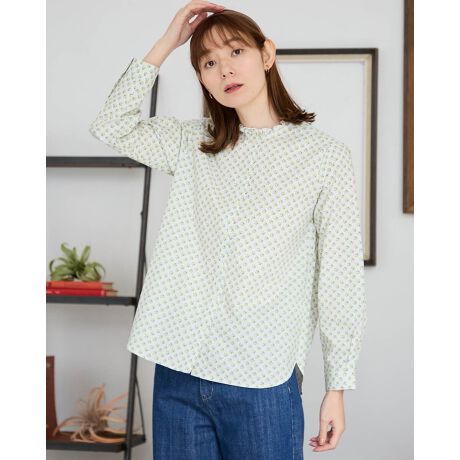 首元にフリルをあしらった小花柄のブラウスです。程よいハリ感できれい見えしつつ日常のカジュアルな着こなしにもピッタリです。ニットやベストとのレイヤードもお勧めの1枚です。