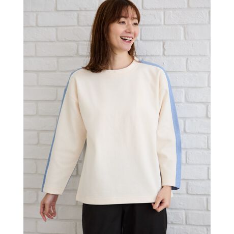 デニム調の布帛素材を袖に切り替えたデザインプルオーバーです。程よいゆとりのコンパクトなデザインで、コートやアウターのインナーにも着用しやすいトップスです。ベーシックなアイボリーとライトグレーの2色展開です。