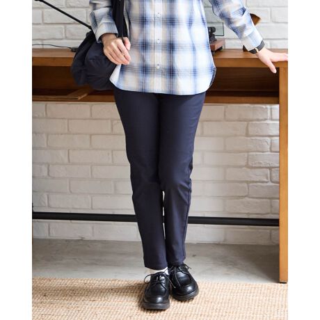 綿・ナイロンのツイルを使用したテーパードパンツです。横方向に良く伸びるハイストレッチ素材を使用してます。デザインはベーシックなテーパードシルエットのファイブポケット、ウエストは開き無しで、股下69cmのアンクル丈です。