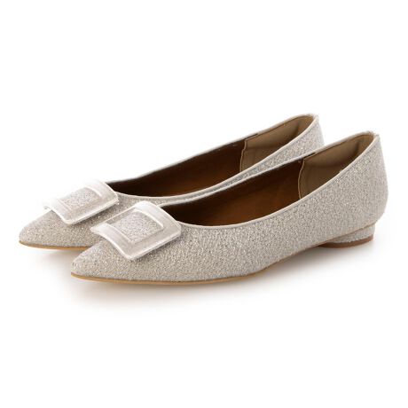 透明度が上品なクリアバックルを採用し、シーズンムードを盛り上げるパンプスが完成。大きめのバックルですがクリアで透け感があるので主張しすぎず、コーディネートにマッチします。春夏らしいキラキラのラメが織り込まれた生地材料を使用しているので、足元が明るく華やかに◎