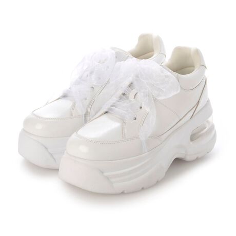 XSサイズからLLサイズまでのサイズ展開!ぷっくりとした厚底のソールがコーディネートにメリハリを出してくれるスニーカー。カジュアルさがあるソールに柔らかいチュールのシューレースを合わせてリボンレースの雰囲気をプラス。カジュアルになりすぎずスカートにも合うスニーカーに仕上げました。シンプルな付け替えシューレースも付いているので雰囲気の変化を楽しめて、もちろんカジュアルコーデにもばっちりハマります。見た目以上に軽量なのでデイリーで使える履き心地に◎
