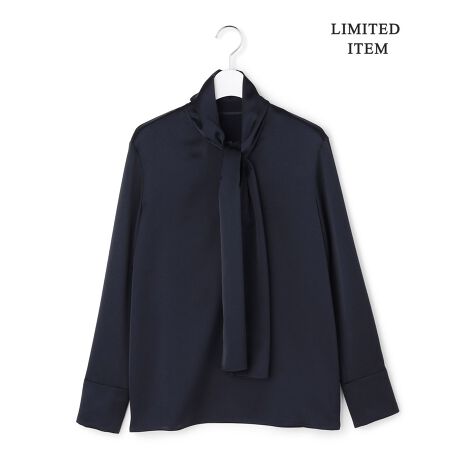 サテン素材とボウタイデザインが女性らしい印象の華やぎブラウス