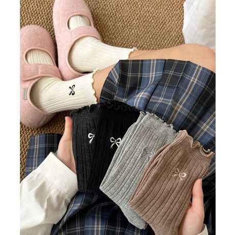 シンプルな生地にワンポイントのリボン刺繍が大人かわいいクルーソックス。