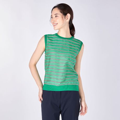 コットン混合生地を密に編んだ、高級感あるハイゲージニットベスト。ボーダー柄が着こなしのアクセントになるスタイリッシュなデザイン。メリハリをつけたカラーのリブがアクセント。ゆとりのあるサイズ感で、様々なトップスにマッチします。おしゃれな重ね着コーディネートが完成する便利なアイテム。
