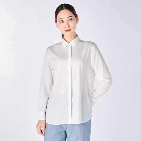 透け感のある軽やかなシフォン生地で仕立てた長袖ブラウス。ストレッチ機能のある生地なので、身体の動きに合わせてフィットする快適な着心地も特徴。インナーによって異なるムードの重ね着が楽しいアイテム。シンプルなデザインでボトムを選ばず着こなせて、スタイリッシュなコーディネートが実現する一枚です。