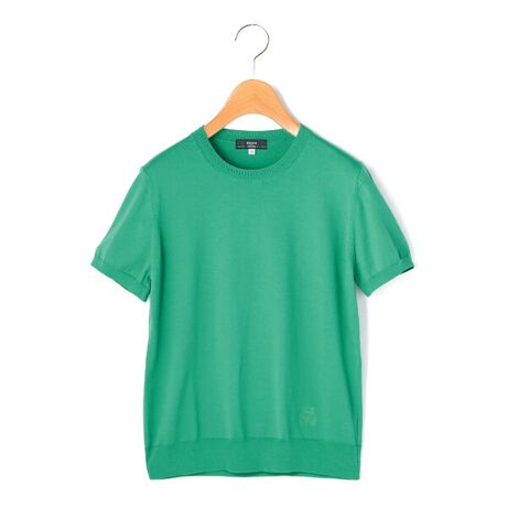 高級感あるハイゲージ編みの半袖ニット。左裾のブランドエンブレム刺繍がさりげなくおしゃれで上品なデザイン。少し丸みのある袖、袖口と裾のリブがシルエットのメリハリあるアクセント。シンプルなデザインでボトムを選ばず着こなせます。お出かけにもオフィスカジュアルにも幅広く活躍する一枚です。